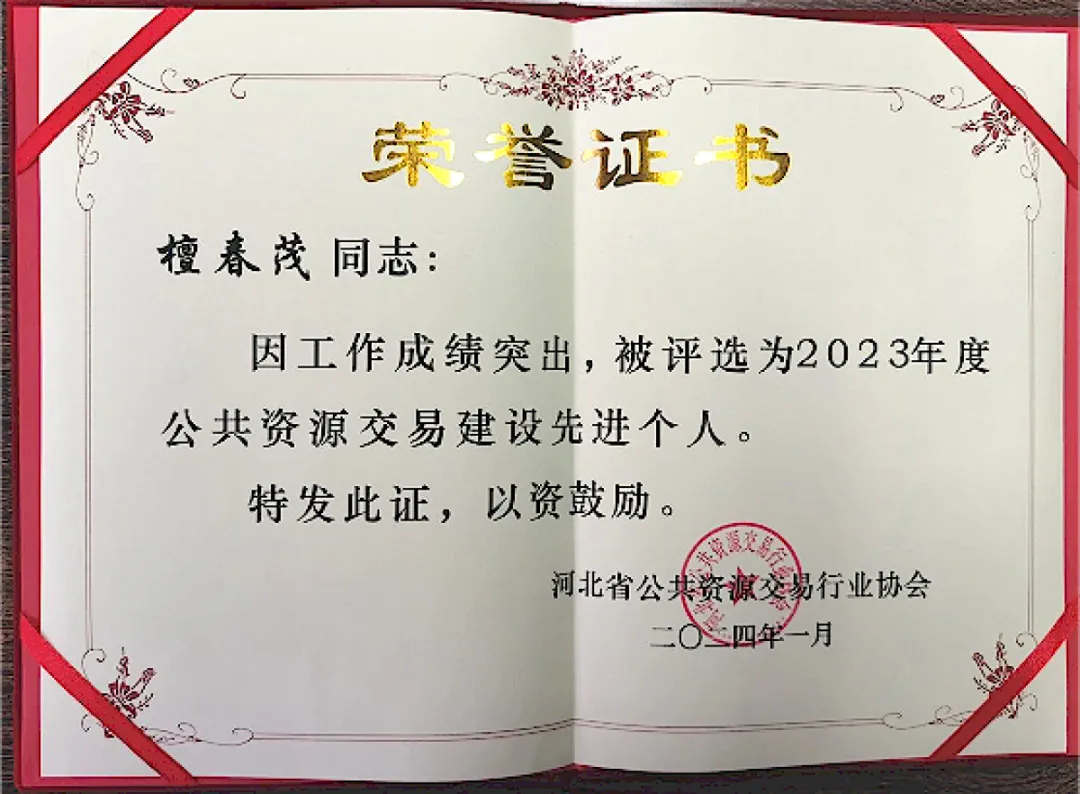 在會議上,河北CA及市場總監檀春茂榮獲雙證書,分別為“優質服務機構”榮譽獎牌和“公共資源交易建設先進個人”榮譽證書,這是對河北CA過去一年里積極參與河北省公共資源交易行業協會工作、助力河北公共資源行業高質量發展的認可與鼓勵。