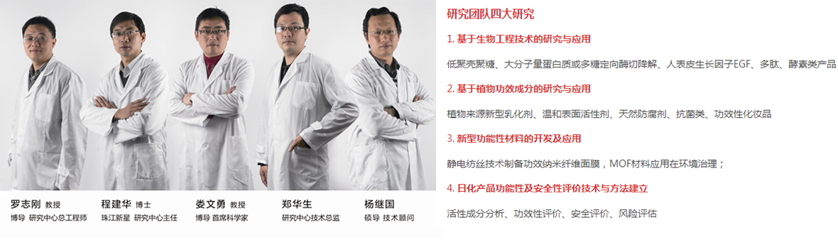 公司與華南理工大學個人護膚品創(chuàng)新研究中心建立了戰(zhàn)略合作伙伴關系,研發(fā)團隊是由華南理工大學生物醫(yī)學、輕化工、高分子材料和綠色環(huán)保等領域的知名教授專家組建而成,并與全球科研機構及專家合作進行日用化學和個人護理品領域的前沿科學技術研究;中心依托華南理工大學強大的科研實驗平臺和人才優(yōu)勢,整合校內各學科資源進行集成創(chuàng)新;研發(fā)中心擁有一支有專家教授、博士、碩士、歸國人員等組成的精英團隊,開展日化產品、個人護理品以及養(yǎng)生用品等方面的核心技術開發(fā)、配方設計、功效評價和安全性能評估等方面的研究;中心設備先進,擁有國家級的重點實驗室、分析測試中心和天然產物開發(fā)中心,立足華南,服務全國,為國內外企業(yè)提供創(chuàng)新技術支撐和服務交流平臺。